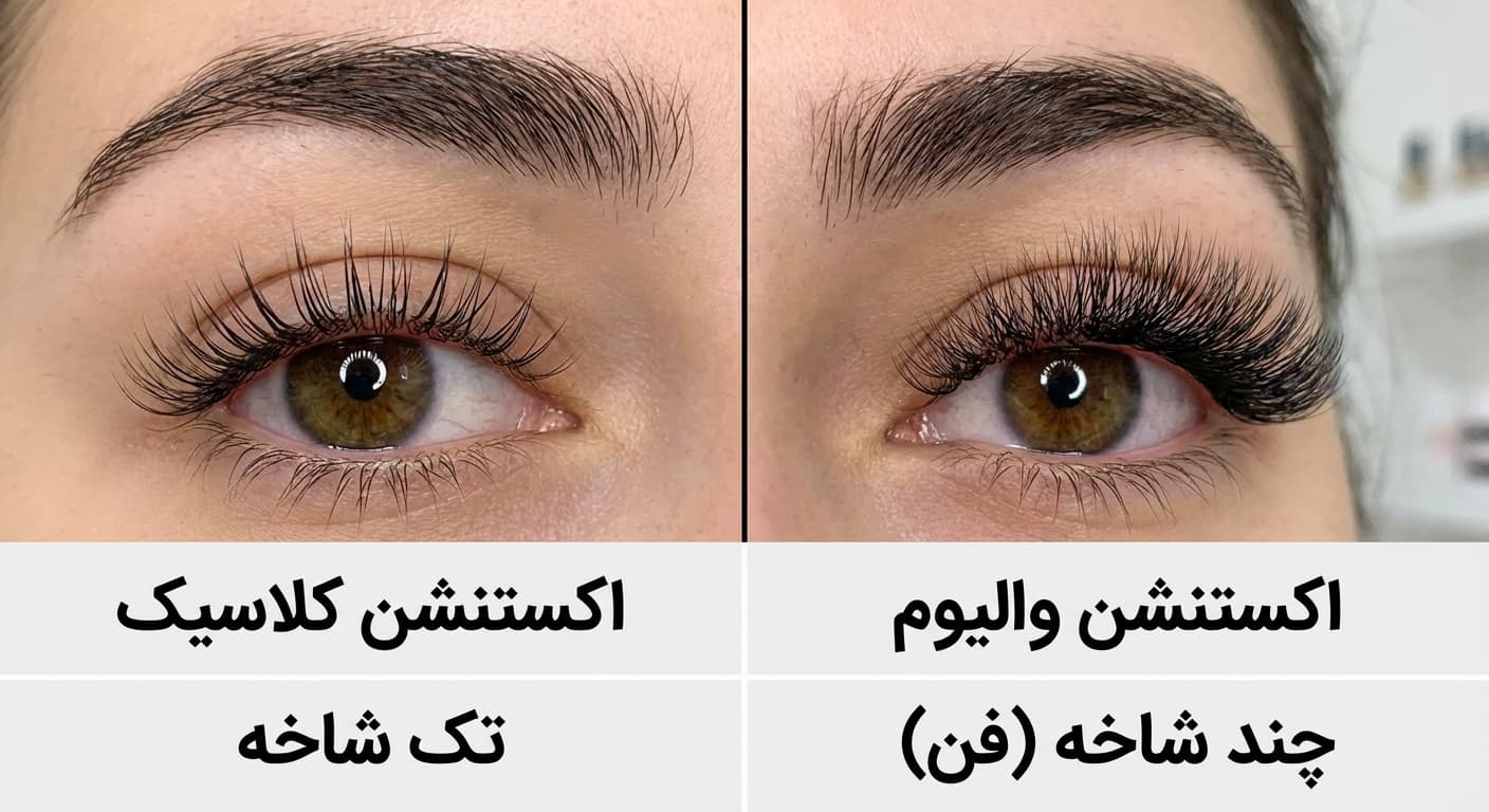 اکستنشن مژه کلاسیک ظاهری ساده و طبیعی ایجاد میکند، در حالی که اکستنشن مژه والیوم به دلیل تراکم بیشتر، ظاهری پرتر و برجستهتر دارد.